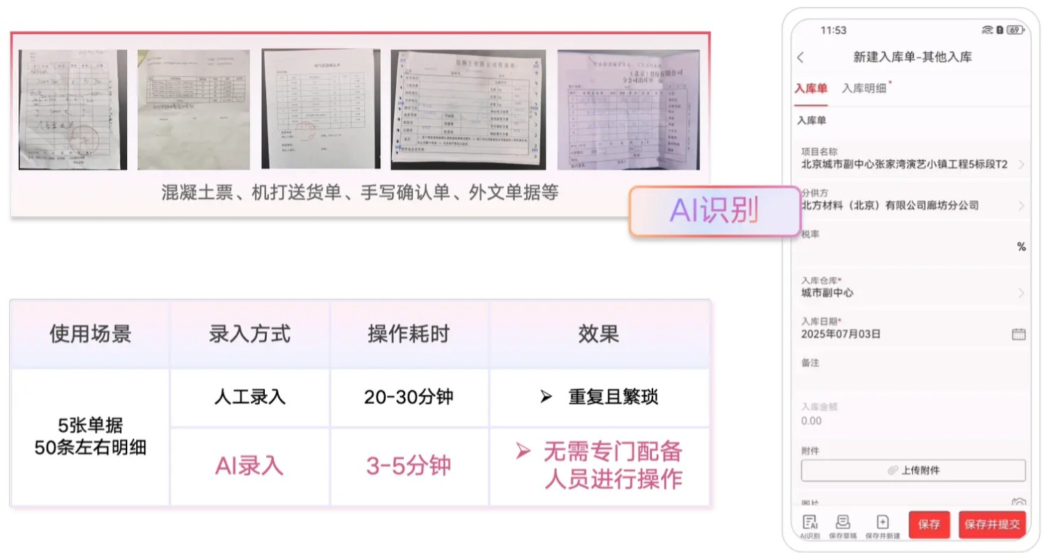 AI錄單助手能夠自動(dòng)從入庫(kù)單中識(shí)別出材料的名稱、規(guī)格、數(shù)量等信息,并進(jìn)行數(shù)據(jù)回填。系統(tǒng)還會(huì)在數(shù)據(jù)錄入時(shí)進(jìn)行實(shí)時(shí)成本預(yù)警,確保企業(yè)在采購(gòu)環(huán)節(jié)能夠精確把控成本。通過(guò)AI的輔助,入庫(kù)單的錄入時(shí)長(zhǎng)縮短了80%,而成本控制的準(zhǔn)確性提高了20%,極大提高了企業(yè)的資金使用效率。