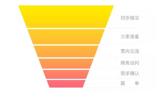 舉個例子,健康的銷售漏斗應該是上圖這樣的,各階段的轉化率比較均勻,如果漏斗在中間某一段突然收窄,可能是在業(yè)務推進的某個階段出現(xiàn)了瓶頸,這時企業(yè)需要結合產品的銷售周期等因素,尋找漏斗“阻塞”的原因,及時做出調整。