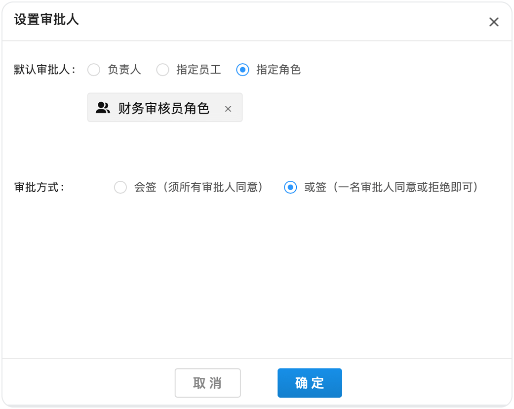 如果小王的公司對報銷把控比較嚴格,要求兩個財務審核同事全部同意后流程才能通過,那么可以在后臺將他們設置成“多人會簽”。