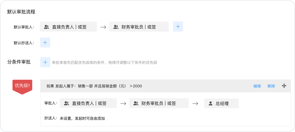 小王這次要報銷2500元的出差費用,而公司規(guī)定報銷超出2000元就需要總經(jīng)理進行額外審批。這種情況可以通過設置“分條件審批”功能來實現(xiàn),將報銷金額是否大于2000作為判斷應該走哪一條流程的條件:1)金額小于等于2000元時,流程按“直接負責人-財務審核員”執(zhí)行;2)金額大于2000元時,流程按“直接負責人-財務審核員-總經(jīng)理”執(zhí)行。分條件審批不僅可以設置按金額判斷,還可以設置按發(fā)起人部門、報銷類型等判斷。
