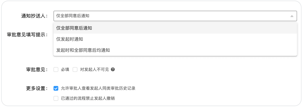 小王的出差報銷最終通過了,這時還需要抄送給辦公室的行政同事以便日后進行成本分析。過去,報銷審批一經(jīng)發(fā)起就抄送給了行政同事,但有些審批后期撤銷了但沒有通知行政同事,造成后期分析時數(shù)據(jù)存在誤差,現(xiàn)在可以通過設置“僅全部同意后通知”的抄送模式來避免這一問題。抄送共有3種模式,企業(yè)可根據(jù)實際場景靈活選擇。