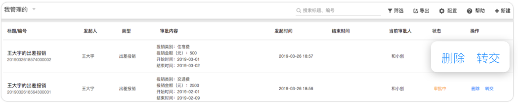 小王平時不僅會提交“出差報銷”這種辦公類審批,還會提交“合同審核”這種經(jīng)營類審批。公司希望每類審批都由專人來管理模板與數(shù)據(jù),防止敏感數(shù)據(jù)內(nèi)部泄露。這時公司可以為每個審批設置“模板管理員”,由該審批生成的全部數(shù)據(jù)將只能由這個模板管理員維護并導出。同時他也可以將審批中的流程轉交給其他人,以避免出現(xiàn)審批人休假或離職后流程卡住的情況。模板管理員還可以協(xié)助企業(yè)管理員來編輯審批模板,有效分擔工作。