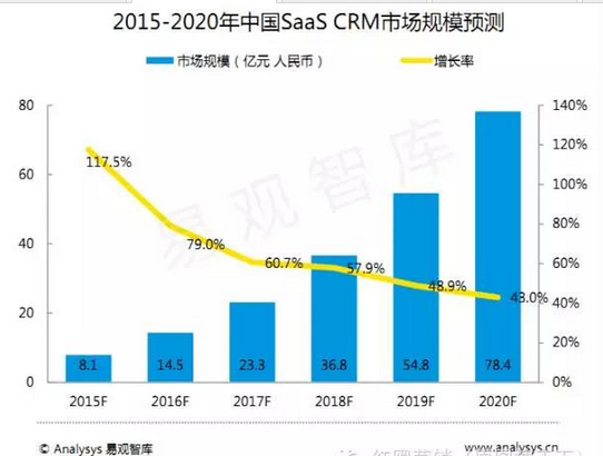 報告指出,國內SaaS CRM市場在2014年的增長率達到了176.9%,市場規(guī)模從1.3億元人民幣增長到了3.7億元人民幣,2015年的增長率預計達到117.5%,市場規(guī)模增長到8.1億元人民幣。2015-2020年市場還會保持較高速度增長,但是隨著市場規(guī)模的逐漸擴大,增長將趨于平穩(wěn),中國傳統(tǒng)中小企業(yè)的互聯(lián)網(wǎng)化轉型將成為市場規(guī)模增長的主要動力,而隨著中國傳統(tǒng)中小企業(yè)互聯(lián)網(wǎng)化轉型的逐漸完成,SaaS CRM市場的企業(yè)數(shù)量將保持在一個平穩(wěn)的水平,市場的規(guī)模增長將來源于更加專業(yè)以及更加多元化的產(chǎn)品服務。
