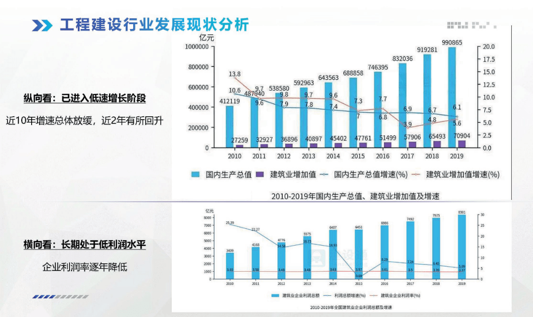 經過對近十年數據的對比分析,可以看出建筑業作為國民經濟支柱產業之一,地位依舊穩固。但是如何擺脫利潤率偏低的現狀、如何提高企業競爭力成為了當今需要探討的問題。