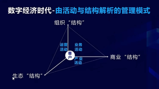 我們對于今天任何一個企業的數字化轉型,大家記住,跟工業時代不太一樣的是你得完成三個結構:一個結構是現在有的組織架構,一個是你跟顧客關系的商業結構,還有一個是你跟產業關系的生態結構。你必須得三個結構都做到。如果你沒有能力,從組織結構這個系統完成運營跟業務活動,從商業結構這個系統完成業務跟產業活動,然后從產業結構這個系統完成運營跟產業活動,你是不可能做數字化轉型的。