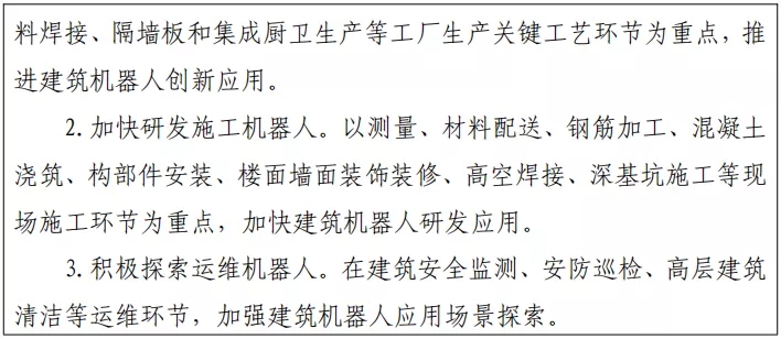 積極推進(jìn)建筑機(jī)器人在生產(chǎn)、施工、維保等環(huán)節(jié)的典型應(yīng)用,重點(diǎn)推進(jìn)與裝配式建筑相配套的建筑機(jī)器人應(yīng)用,輔助和替代“危、繁、臟、重”施工作業(yè)。