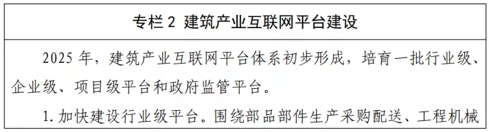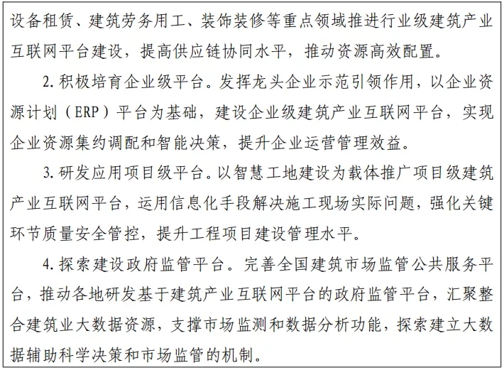 開展建筑產(chǎn)業(yè)互聯(lián)網(wǎng)平臺建設(shè)試點(diǎn),培育一批行業(yè)級、企業(yè)級、項目級建筑產(chǎn)業(yè)互聯(lián)網(wǎng)平臺,建設(shè)政府監(jiān)管平臺。