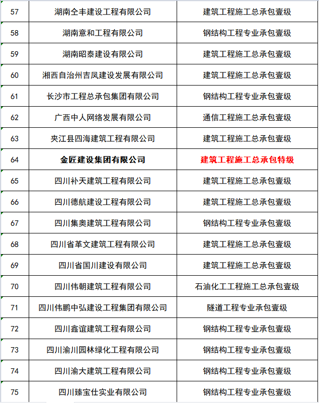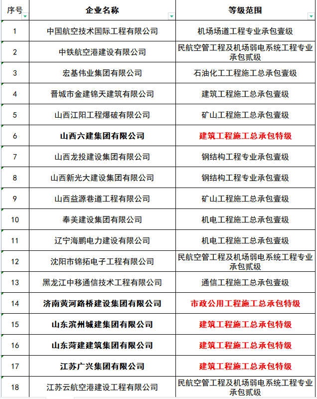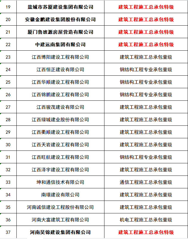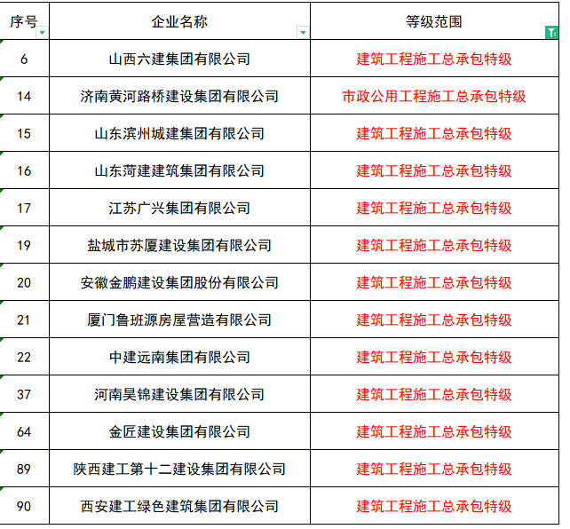 截至2023年上半年,住建部共公布了五批升特建企名單,6月9日住建部官網發布的《關于核準2023年度第五批建設工程企業資質名單的公告》中,共有13家建企“升特”,具體請看以下名單: