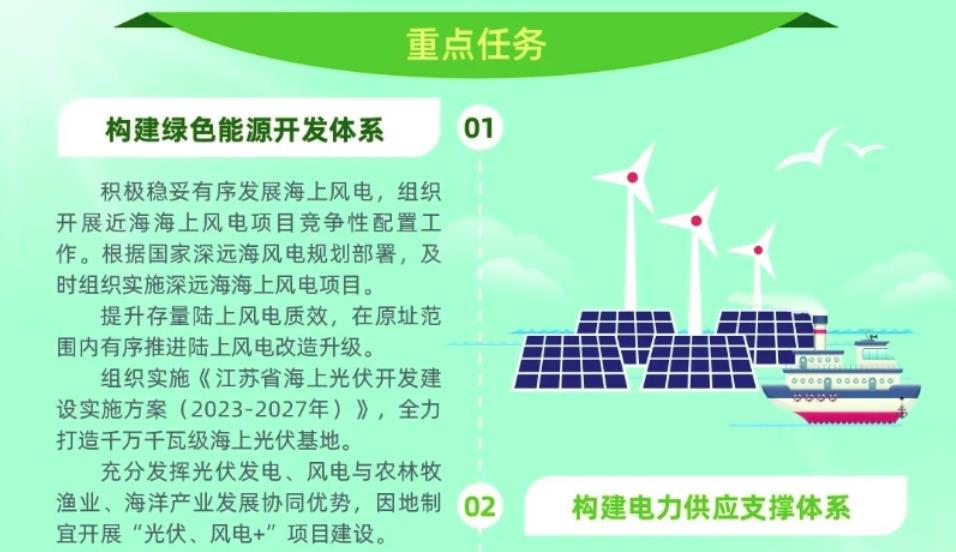 提出積極穩妥有序發展海上風電,組織開展近海海上風電項目競爭性配置工作。根據國家深遠海風電規劃部署,及時組織實施深遠海海上風電項目。提升存量陸上風電質效,在原址范圍內有序推進陸上風電改造升級。組織實施《江蘇省海上光伏開發建設實施方案(2023-2027年)》,全力打造千萬千瓦級海上光伏基地。充分發揮光伏發電、風電與農林牧漁業、海洋產業發展協同優勢,因地制宜開展“光伏、風電+”項目建設。