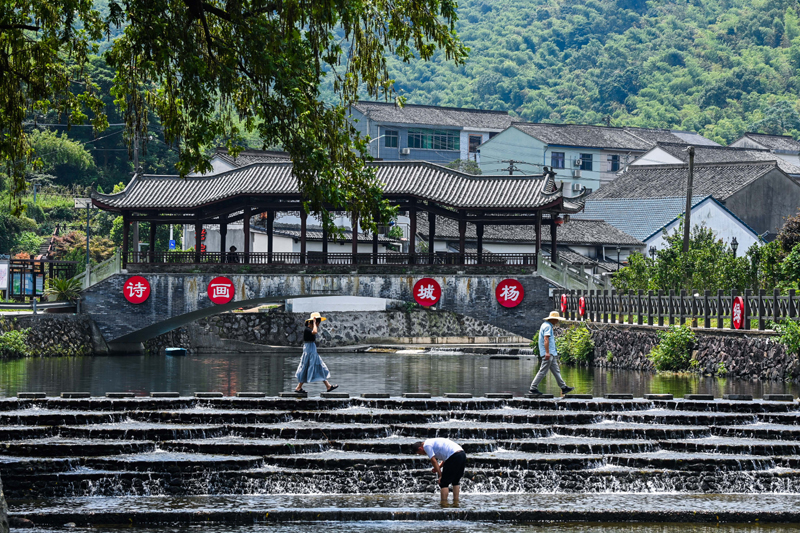2023年8月10日,游客在浙江省寧波市鄞州區城楊村的溪流玩耍。新華社記者 徐昱 攝