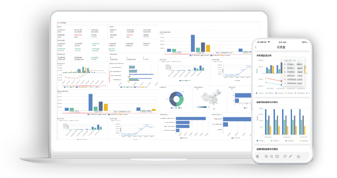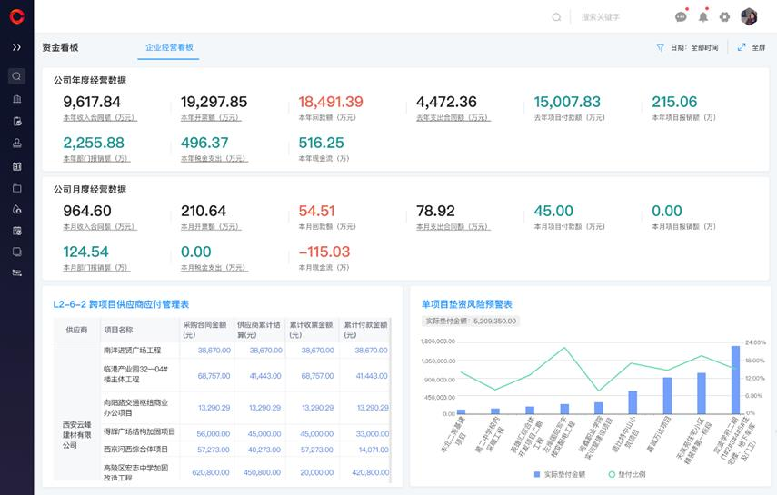 ● 實時監控單項目/多項目的應收、應付、墊資數據,合同流、發票流、資金流全鏈路透明化,規避超付風險。管理層可一鍵查看資金動態,確保現金流穩健。