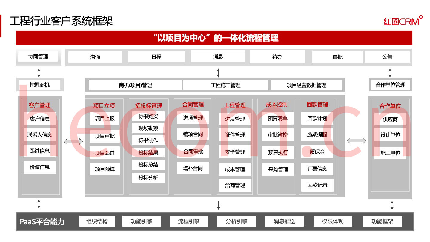 隨著市場(chǎng)經(jīng)濟(jì)的高速發(fā)展,企業(yè)間的競(jìng)爭(zhēng)日趨激烈,深受政策影響的建筑工程企業(yè)也不例外,強(qiáng)化項(xiàng)目過(guò)程精細(xì)化管理,已經(jīng)成為建筑工程企業(yè)提升競(jìng)爭(zhēng)力的重要途徑。紅圈借助互聯(lián)網(wǎng)、云計(jì)算、移動(dòng)大數(shù)據(jù)等技術(shù),基于自主研發(fā)的紅圈 PaaS 平臺(tái)推出了紅圈 CRM 建筑工程項(xiàng)目管理系統(tǒng),幫助建筑工程企業(yè)進(jìn)行業(yè)務(wù)流程梳理,打造以項(xiàng)目為中心的移動(dòng)管理平臺(tái),從而助力建筑工程企業(yè)在日益激烈的競(jìng)爭(zhēng)中處于領(lǐng)先優(yōu)勢(shì)。紅圈 CRM 建筑工程項(xiàng)目管理系統(tǒng)適用于房建工程、市政工程、地基工程、水利工程、園林工程、環(huán)保工程、電力工程、道路工程等行業(yè)企業(yè)。